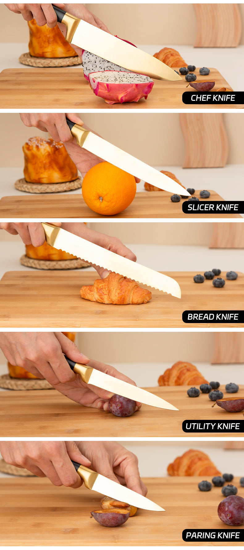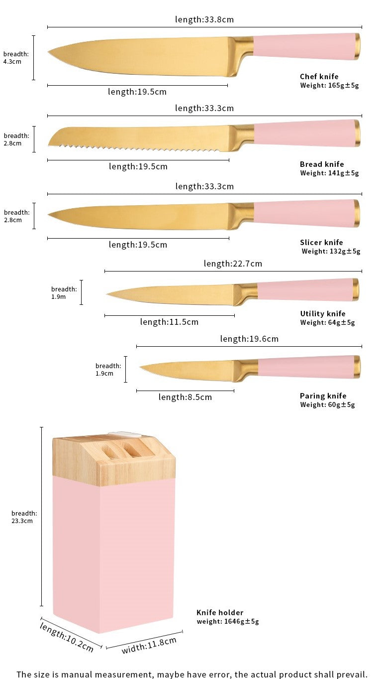 Our knives sets are stainless steel with gold coating. The knife block is made from wood. Our knives sets are ideal for straight cuts of fruit, vegetables and boneless meats. The knives are comfortable to hold and will allow you to have a firm, good grip. Each of our knives have individually been been hand sharpened to create the maximum sharpness ready for use. It is finished with a seamless welding process to avoid food getting stuck between the blade and handle to assure you have an easy cleaning process.