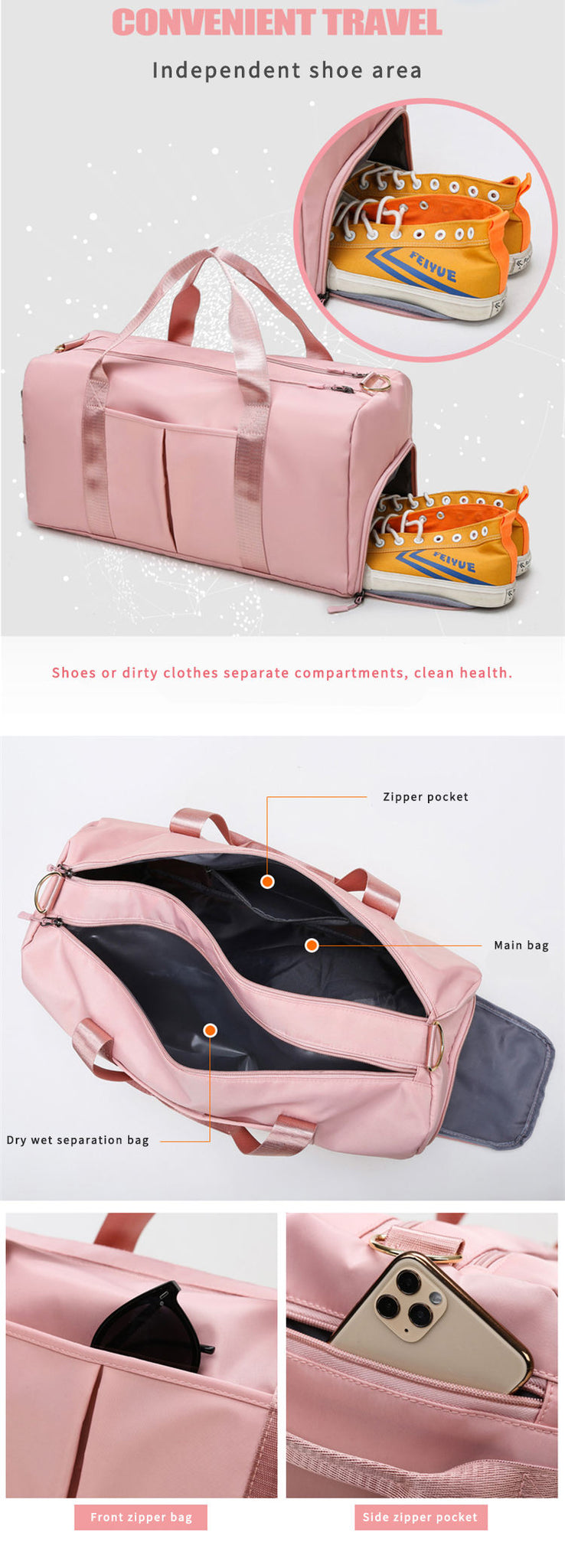 Our Stefania Rose duffle bag is the bag you need for all of your travel, fitness and hospital stays! It is wear-resistant and water-repellent. The convenience of a separate wet compartment for your sweaty clothes, towels, toiletries, etc, will not only keep the rest of your contents dry but you can also have clean fresh clothes to enjoy the rest of your day/stay! The benefits of our AAA+ design duffle bag are the comfortable handle, stitching reinforcement, and our amazing gold hardware accessories, and did I mention YOU HAVE YOUR OWN SHOE AREA! If your looking for a bag with unlimited storage the Stefania Rose duffle bag is for you.